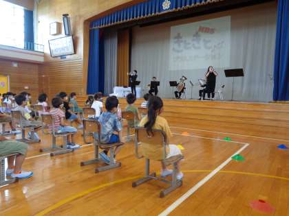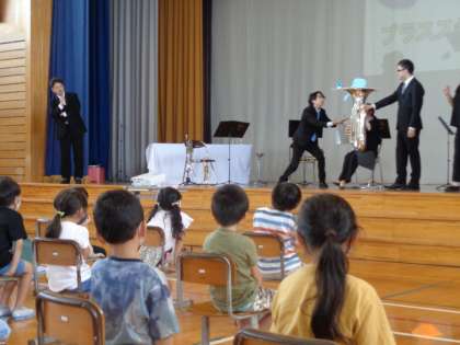 今日は、きときとブラスステーションの方々の演奏がありました。トランペットやホルンなどの様々な楽器の特徴や音色に触れ、演奏を楽しむ様子がありました。