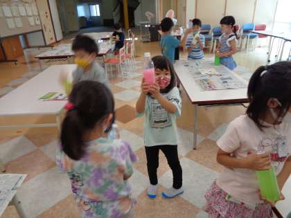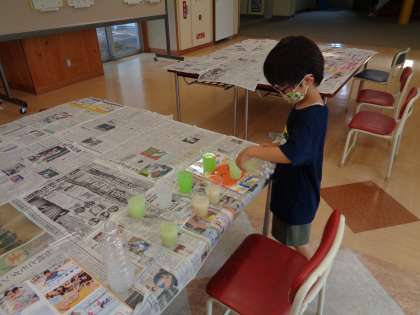 今日の図工では、水に絵の具を溶かして、色水を作りました。子供たちは、いろいろな色を混ぜて、「ぶどうジュースだ」「ライトグリーンになったよ」などと話していました。