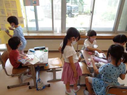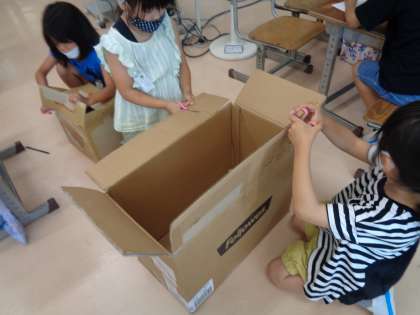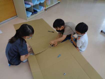 今日の生活の時間では、水遊びにむけて準備をしました。必要なものを確認し、ダンボールやカップを使って道具を作り始めました。固いダンボールを一生懸命はさみで切っている姿が見られました。どんな遊びになるのか、楽しみですね。