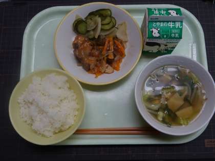 ごはん、牛乳、魚の野菜あんからめ、華風あえ、豆腐スープ