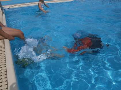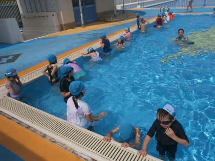 初めてのプール学習でした。少しずつ水をかけながら、だんだんとプールの中へ・・・。