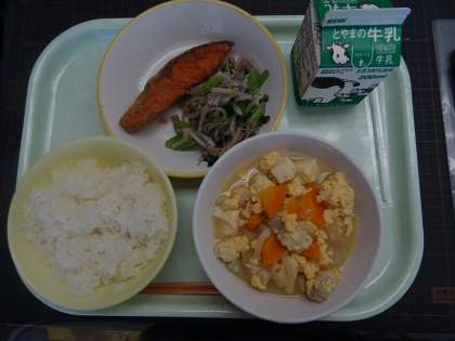 ごはん、牛乳、魚の竜田揚げ、ゆかり和え、親子煮