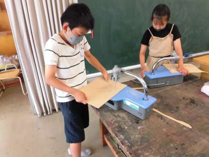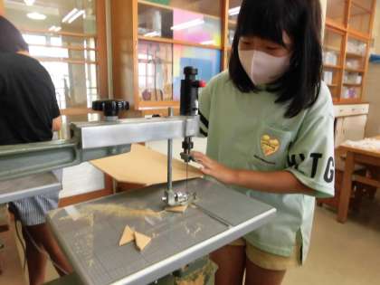 図工の時間に糸のこを使って、伝言板を作成しています。思った通りに木を切ることが難しく、操作を焦ると、すぐに下書きの線から外れて行ってしまいます。慎重に落ち着いて少しずつ・・・慣れてくるとスムーズに切ることができるようになってきました。