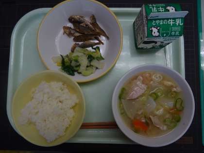 ごはん、牛乳、小アジの唐揚げ、チンゲンサイひたし、豚汁