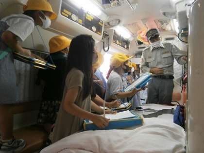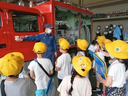 大山消防署では、救急車や消防車のことについて、詳しく教えていただきました。メモを取ったり質問したりしていました。