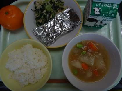 ごはん、さばの銀紙焼き、はりはり和え、冬瓜の吉野煮、冷凍みかん