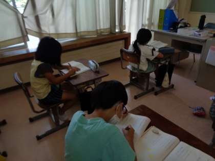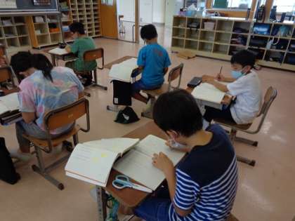 国語の時間に、金子みすゞ作「わたしと小鳥とすずと」の学習をしました。実際に飛んでみたり、体をゆすったりしながら読んだり、挿絵を丁寧に模写したりして、作品のイメージを広げ、読み味わいました。