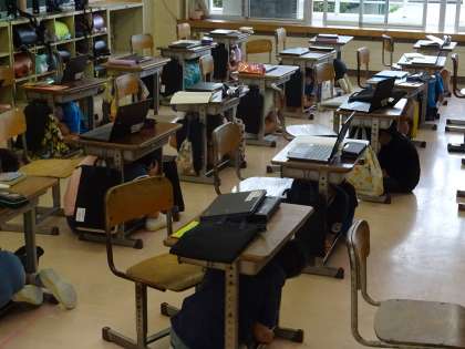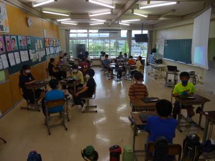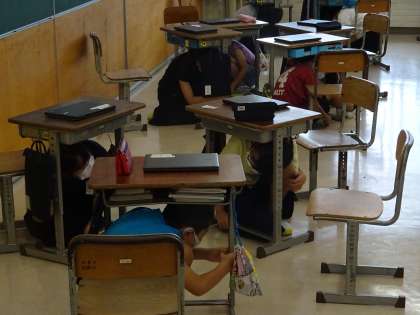 音声に合わせてみんなで一斉に、「しゃがんで」「隠れて」「じっとして」身を守るための正しい行動をとりました。
