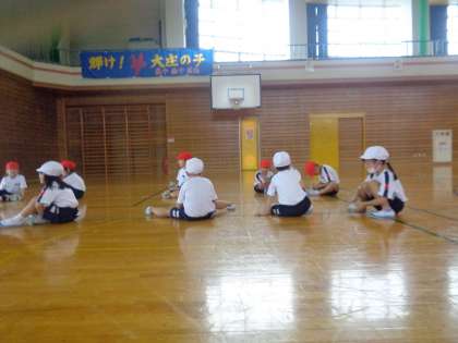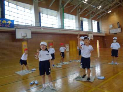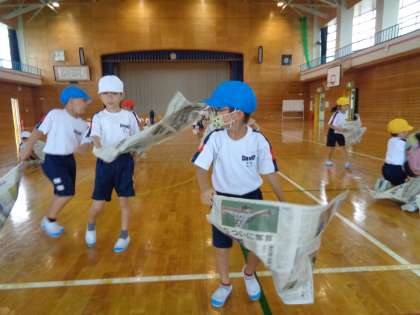 今日の体育では、新聞を使った活動を行いました。新聞紙を持って走ったり、体に巻いて走ったりしました。新聞紙を足の下に敷いて新聞じゃんけんを楽しむ姿も見られました。最後は子供たち自身が新聞紙になりきって丸まったり広がったりしていました。