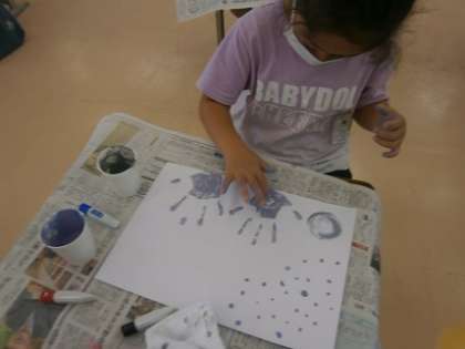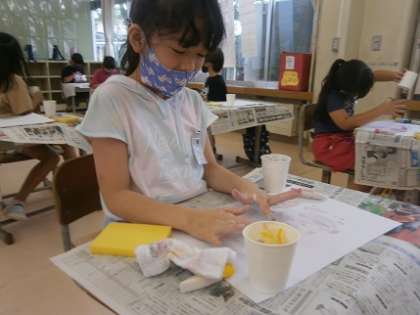 図画工作科「とろとろえのぐでかこう」の学習を行いました。今日は、練習でとろとろの粘土に絵の具を入れて、自分のすきな色をつくり、指で絵を描きました。初めての触感を楽しみながら、活動に取り組みました。