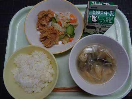 【献立】 ごはん、牛乳、鶏肉の米粉揚げ コールスローサラダ、なすのみそ汁