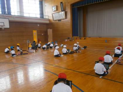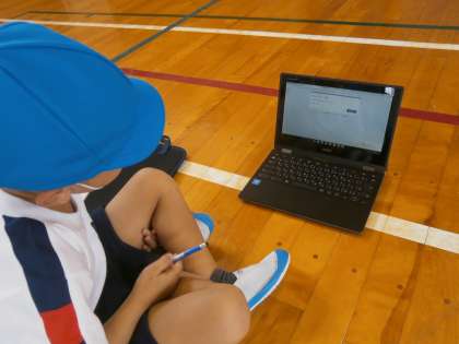 体育の授業でもクロームブックを使い始めました。表現運動で、動物を表現しているところを動画で撮ったり、あいさつや活動について、頑張ったことを振り返ったりしました。