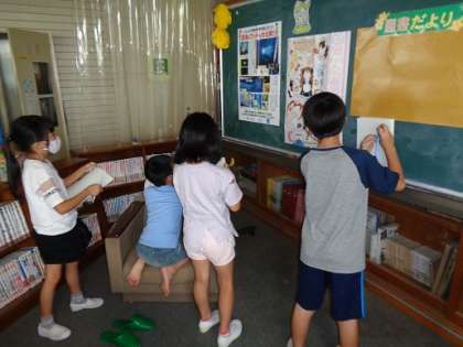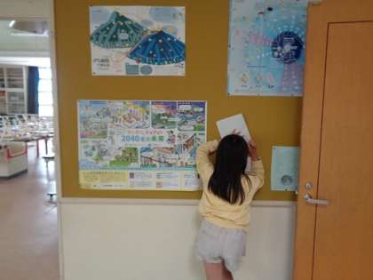 今日は国語の時間に校内のポスターを探し見つけ、ポスターの工夫されているところを見つけました。普段あまり見ていなかった子どもたちも多く、こんなところにこんなポスターがあるんだ、と興味を持って課題に取り組みました。