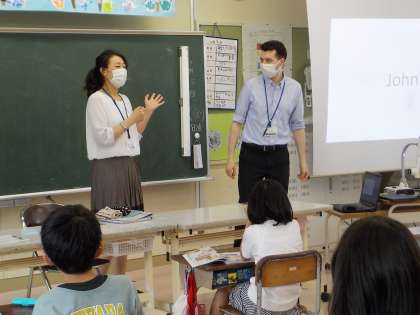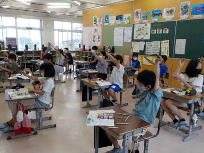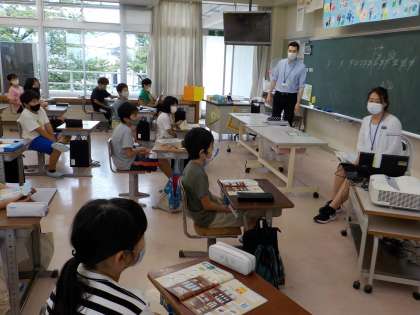 2学期の外国語活動が始まりました。今日から新しいジョン先生との学習です。今日は、筆箱の中身等を英語で発音することに挑戦しました。