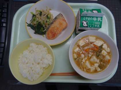 【献立】 ご飯、牛乳、鮭の唐揚げ、小松菜ともやしの香味和え、豆腐の野菜あんかけ