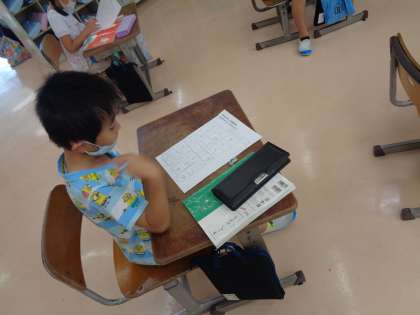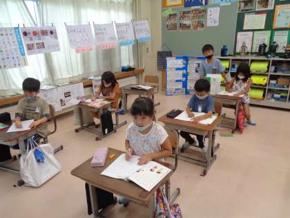 今日の国語では、ことばあそびをしました。9マスの中に平仮名を書き、たて、よこ、ななめでことばできるように並べます。ペアの人が作った問題を一生懸命解いていました。難しい問題を作っている人もいました。
