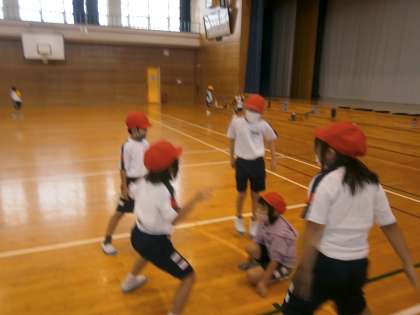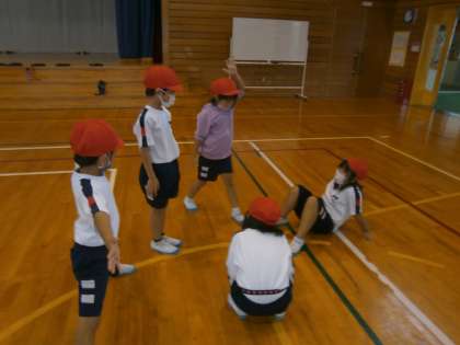 体育で表現運動の学習をしています。各団で発表をします。赤団のテーマは「きょうりゅう」です。今日は話し合いと練習をしました。どうすれば恐竜になりきれるかな。「ガオッ〜!」