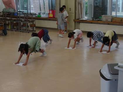 教室がぴかぴかになるよう一生懸命ぞうきんがけをしています。