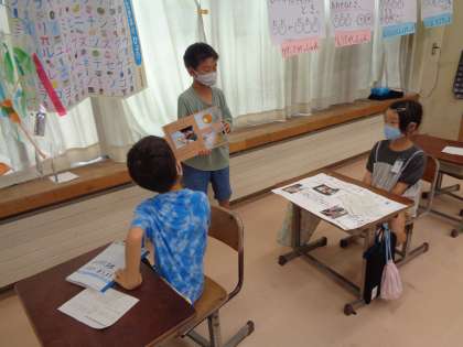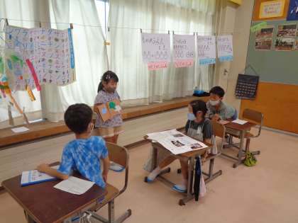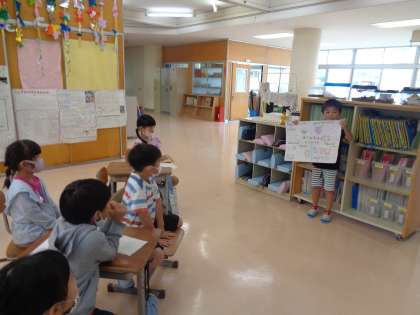 今日は、みんなで自由研究を発表しました。一番頑張ったことをみんなに伝えて、みんなの自由研究を見合いました。初めての自由研究でしたが、いろいろな工夫がしてありました。