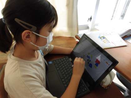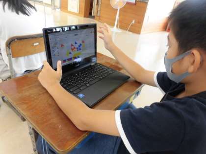 算数科の学習で、図形のしきつめに挑戦しました。クロームブック上で三角形や四角形、五角形をすきまなく並べる活動を通して、三角形、四角形はしきつめられることに気付きました。どうして五角形はしきつめられないのか、これから迫っていきます。