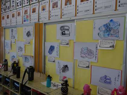 図工の時間に自分たちの普段使っているシューズを描きました。