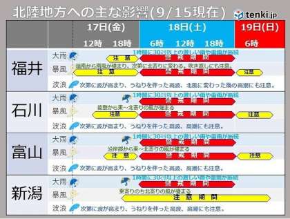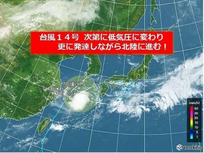 台風第14号は、16日6時現在、五島市の西南西約420kmにあって、北西へゆっくり進んでいます。17日以降に温帯低気圧に変わりますが、台風よりも中心気圧が下がり更に発達、強風域を広げながら18日には北陸地方に近づく見込みです。暴風や大雨に警戒が必要です。