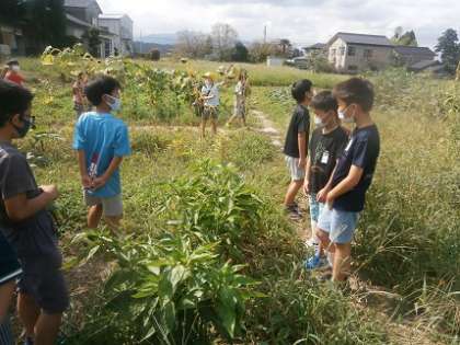 畑へ行って昆虫などの生き物を探し、どんなところを住み家にしているのかを観察しました。