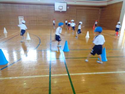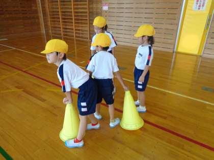 今日の体育は、いろいろなくねくねコースを色団ごとに作りました。今日は、ジグザグコースをどうやったら早く走れるか、コースを作りながら考えました。最後は、速く走るコツを色団ごとで出し合いました。