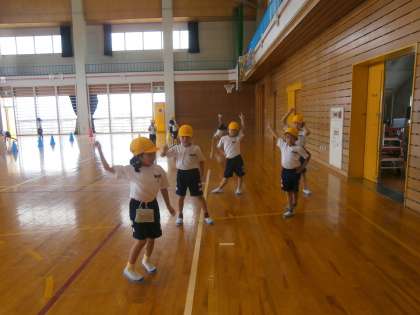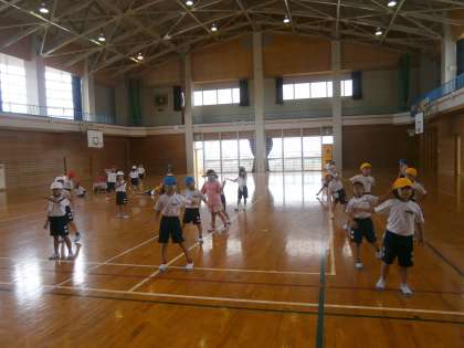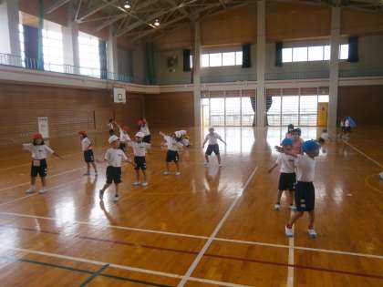 体育に時間にダンスの練習をしています。「アンダー ザ シー」の曲にのって、リズムよくステップを踏んだり、手を大きく広げたりして楽しく踊っています。
