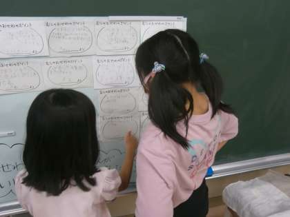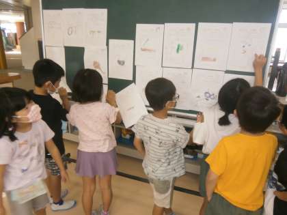 「むしだいすき」の学習もまとめの時期が来ました。ワークシートに書いた内容について、友達と意見交換しました。「○○さんのコオロギは、どの食べものをいちばんたべていたの。」「なすだよ。」や「絵のここの部分は何?」「土だよ。」など、質問したり答えたり、普段関わりの多くない友達とも話している姿が見られました。