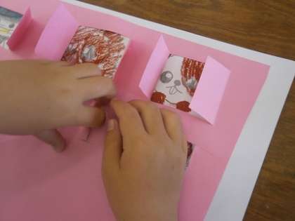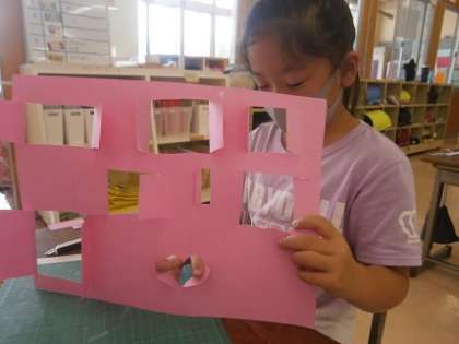 図画工作科「まどからこんにちは」の学習を行いました。カッターの使い方を練習し、窓から動物やキャラクターが出てくるように工夫していました。ハートのかわいらしい窓もありました。