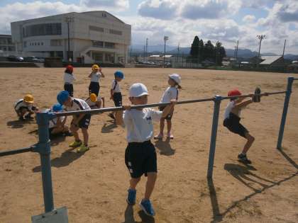 次は、ぶら下がり技に挑戦です。両腕の間に足を入れて「クルッ!」と回って、後ろ手で着地する足抜き回り。手を交差して鉄棒を握り、足を外して半周回る地球回り。器用にお尻を落とさないようにして回ります。来週は技を組み合わせての演技に挑戦します。