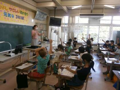 英語専科の先生が「I like pink!」と言うと、子供たちは身の回りからピンクの物を懸命に探しています。ピンクのクレヨンを探しあて、先生に見せていました。