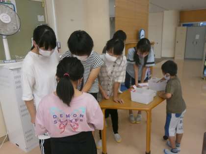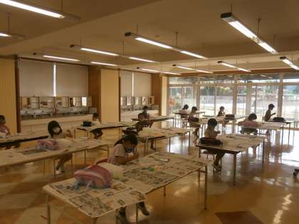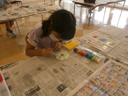 前回の図工の時間に紙粘土で作った作品に、絵の具で色をつけました。初めて使う絵の具に緊張気味でしたが、少しずつ絵の具と水を上手に混ぜ合せて、鮮やかな作品に仕上げていました。