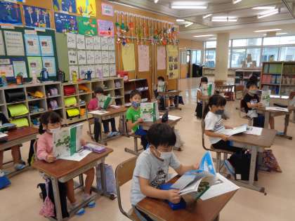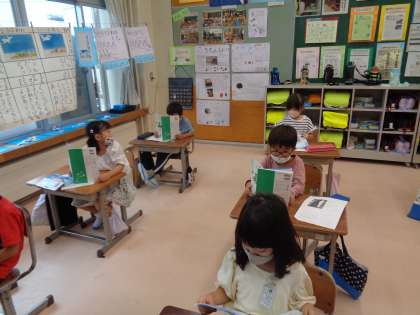 今日の国語は、くじらぐもを音読しました。子供たちの気持ちを想像しながら、「町がきれい」「海に行きたいな」など、セリフをワークシートに書きました。最後は正しい姿勢で音読することができました。