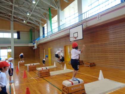 体育の時間に跳び箱をしました。台上からジャンプしてかっこよく着地!楽しく、いろんな跳び方にチャレンジしようと思っています。