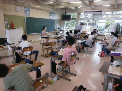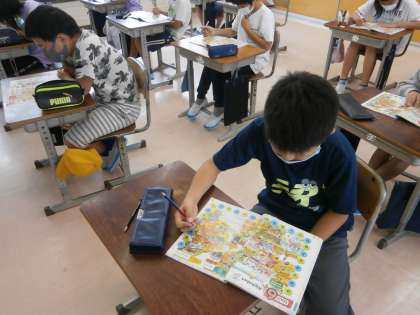 教科書の挿絵に、アルファベットがいくつあるのか数えています。