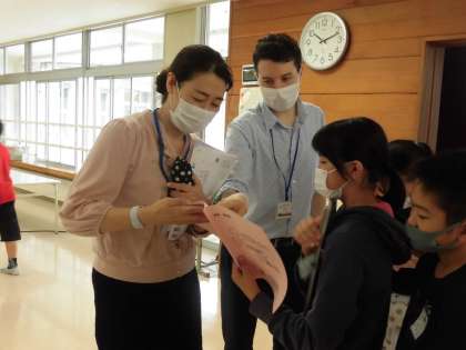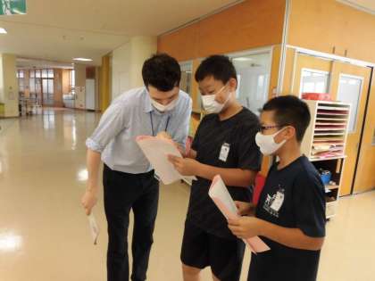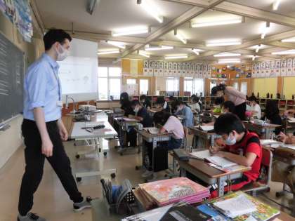 今日は、河合先生とジョン先生と外国語を学習しました。物の位置を表すときに使う英語を勉強し、聞き取った英語から絵の中の物を当てる活動をしました。また、授業後もお二人の周りには5年生の姿が。ある発表で英語を使うことになった5年生は、休み時間も英語を勉強中です。