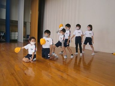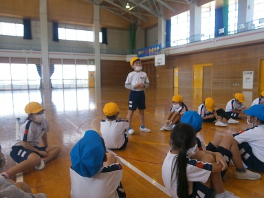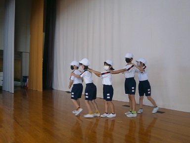 体育科「ゆうえんちへGO!」の学習で、白団と黄団が発表を行いました。白団は、みんなで声を掛け合って互いを助け合い、ジェットコースターではばらばらにならずにつながって表現することができました。黄団は、観覧車を表現するために、手に帽子をもってくるくると回していました。どちらの団も見事なチームワークを見せてくれました。見ていた人も、友達のよかったところを伝えていました。
