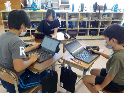 社会科の学習で、もしも地震の後、避難所へ向かうとしたら、避難リュックに何を入れるかについて、考え、グループで話合いました。子供たちは、「学校には、水や食料が少ないから、しっかり持っていった方がいい」「携帯ラジオが必要という意見がよかった」など、必要なものを一生懸命に考えていました。