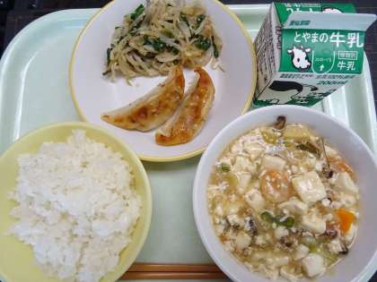 【献立】 ごはん、牛乳 えびと豆腐のうま煮 焼き餃子、ナムル
