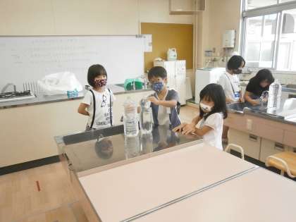 算数でかさの学習をしています。どちらが多く入るかな・・・