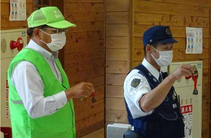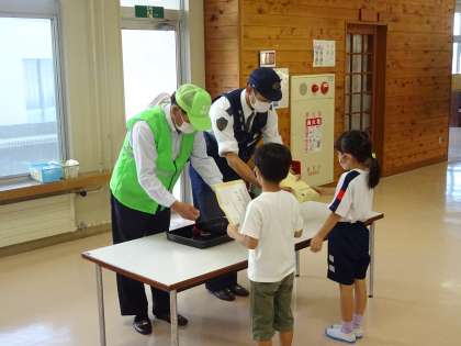 大山交番・大庄地区自治振興会から1年生にクマ鈴の贈呈がありました。