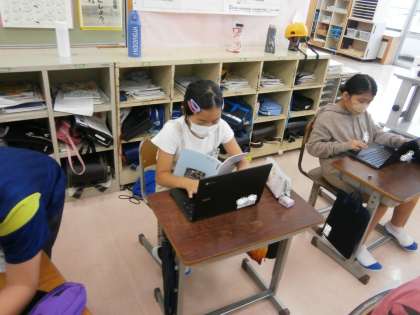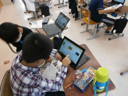 スライドを用いて、曳山祭りについて調べたことをまとめています。