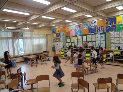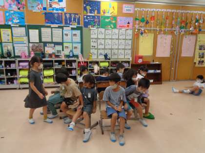 昼休みには、クラスみんなでいすとりゲームを行いました。みんなで決めた遊びを仲良く遊んでいました。