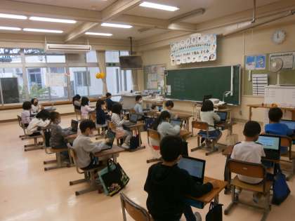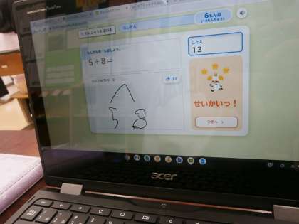 繰り上がりの足し算の学習をしています。「あといくつで10」ができるように頑張っています。クロームブックで繰り返し練習です。