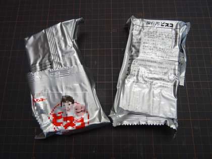 このビスケットは、県が災害時の非常食として備蓄しているものを更新する機会にもらい受けたものです。