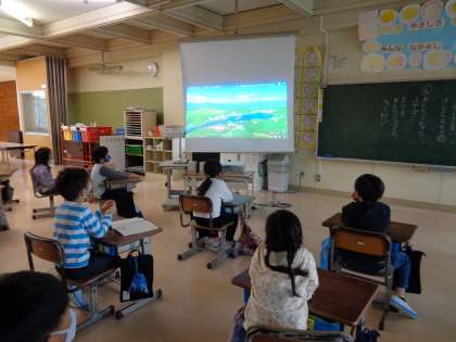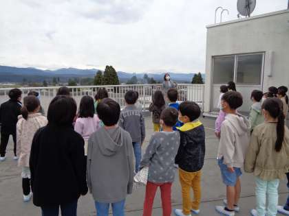 学習発表会に向けて、高いところから見える景色を見て、くじらぐもに乗ったときのわくわく感を実感しました。「車や家が小さい」「自分の家が見える」などと話していました。