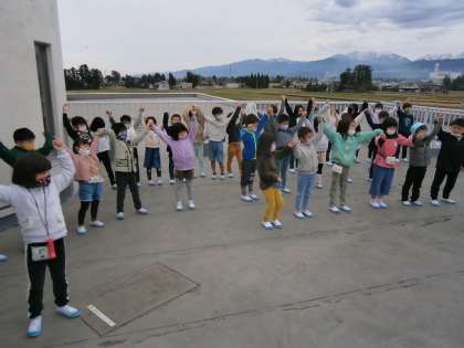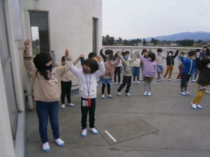くじらぐもに乗ったらどんな景色が見えるのかなぁ、と今日は屋上で練習をしました。見晴らしのよい屋上で、建物や家々を指さして、気持ちのこもった台詞や振りを練習することができました。