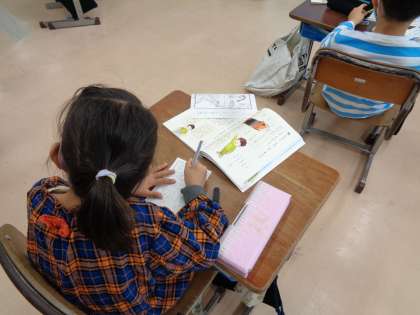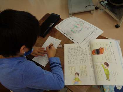 今日の国語では、自分が一番お家の人に知らせたいことを文章に書きました。短冊カード1枚に1つの特徴を書くようにしました。段落のはじめは1マス下げることや、句点をつけて文を読みやすくしたりして工夫しました。